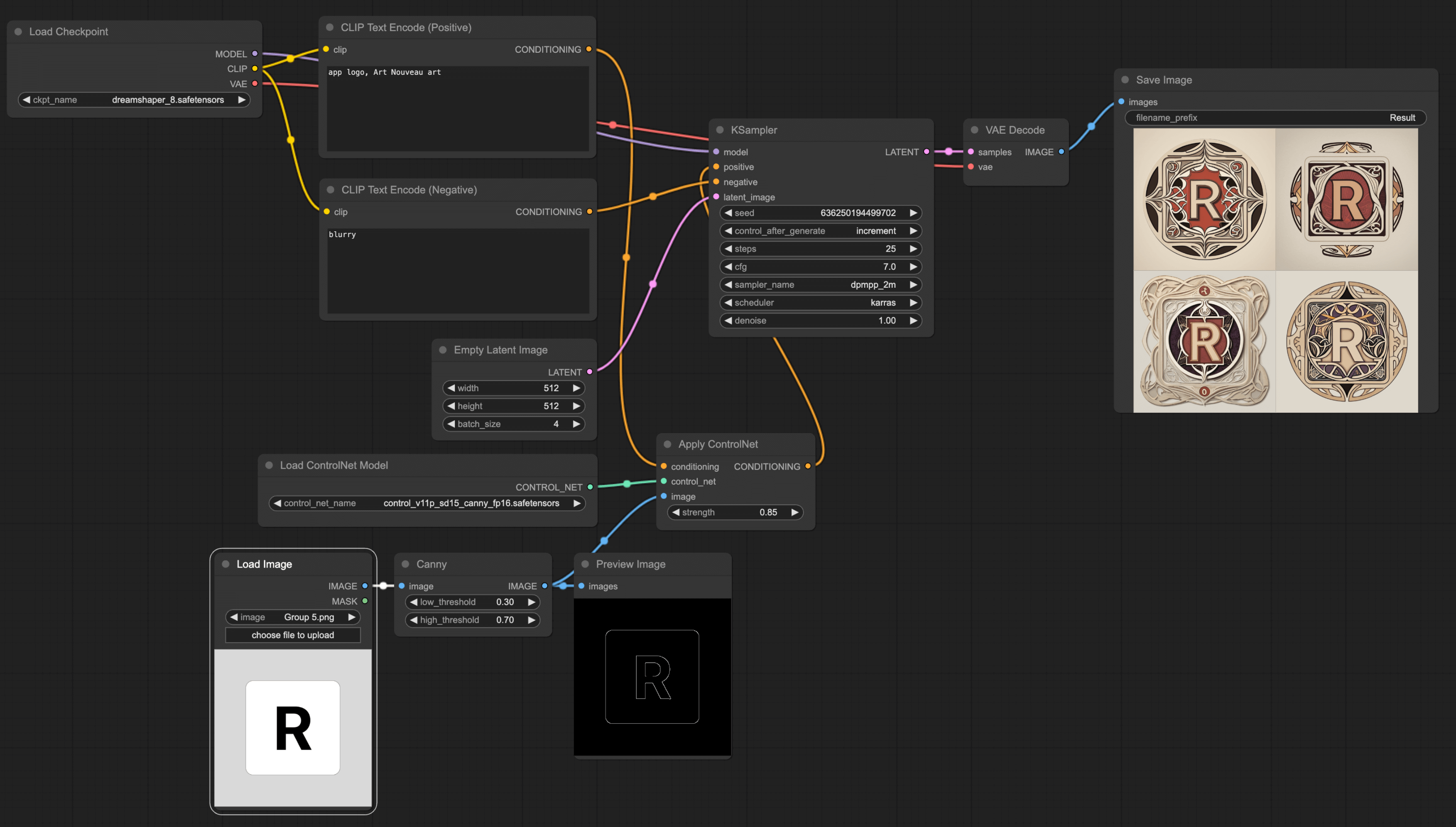 However, during the actual design process, your requirements might not be content-based only. Suppose you already have a preliminary idea, for instance, the logo should include the letter 'R’. In this case, you can utilize the ControlNet technology to assist you in logo creation.