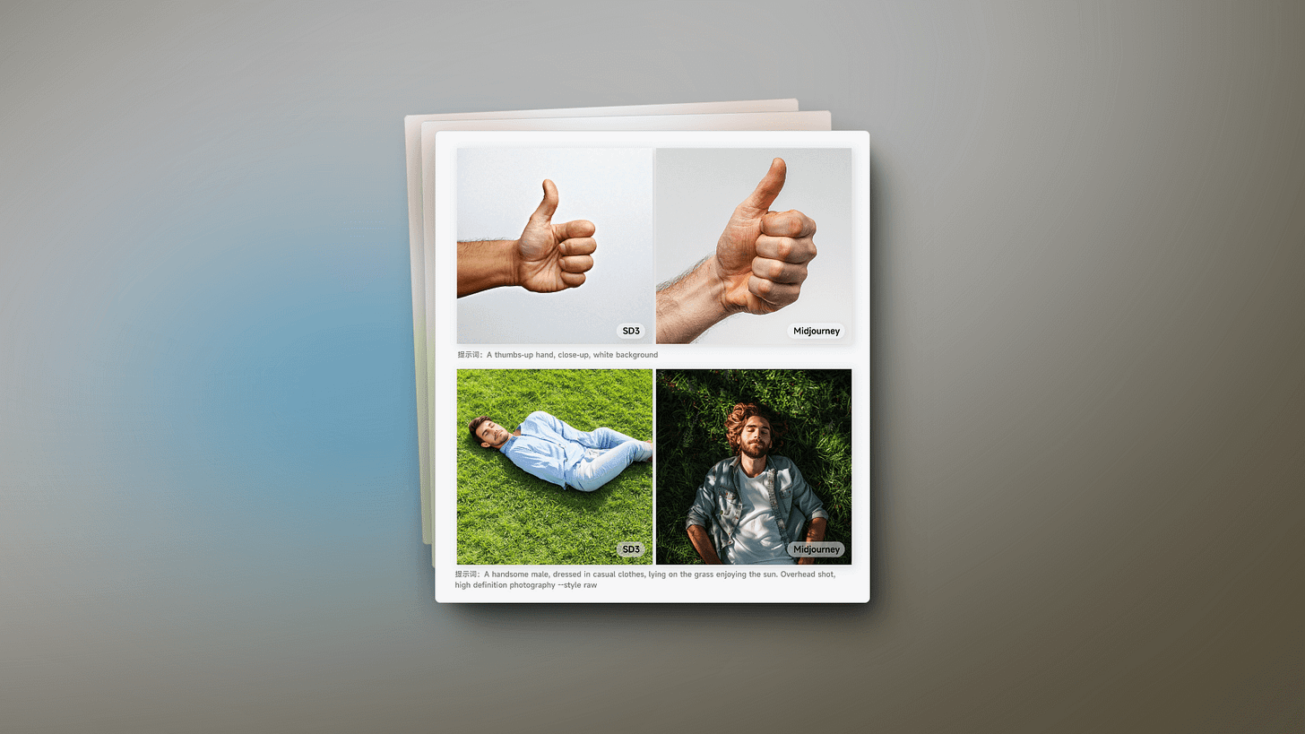 Despite significant improvements in image quality, details, understanding of prompts, and text content generation, SD3 still has some shortcomings. For example, errors may occur when generating hands, and serious distortions can occur when generating full-body characters.