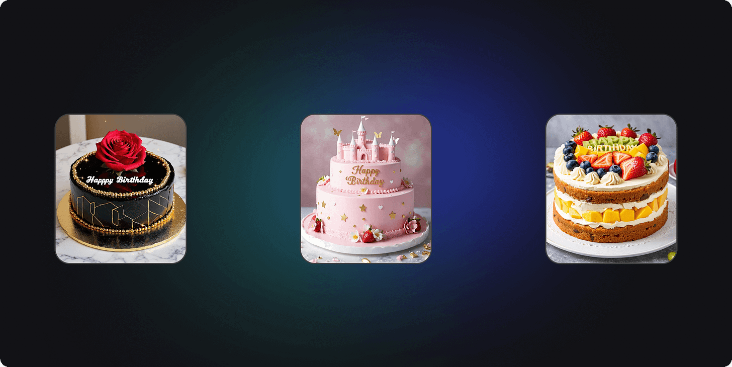 Prompt:A birthday cake with a deep black chocolate sponge as its base, "Happy Birthday",covered with a layer of smooth mirror glaze that reflects a dazzling brilliance. The edges of the cake are decorated with delicate golden sugar beads, forming a bright frame. In the center of the top, a blooming rose is crafted with exquisite sugar art skills, with clear layers of petals that are lifelike. Around the rose, patterns composed of tiny digital pixel points are embellished, twinkling with a soft light in the virtual space, creating a dreamlike effect. The sides of the cake are meticulously outlined with geometric shapes using silver frosting, adding a sense of modernity and artistic flair. The entire cake exudes an enticing luster in the virtual world, making one admire it even knowing it is not edible.