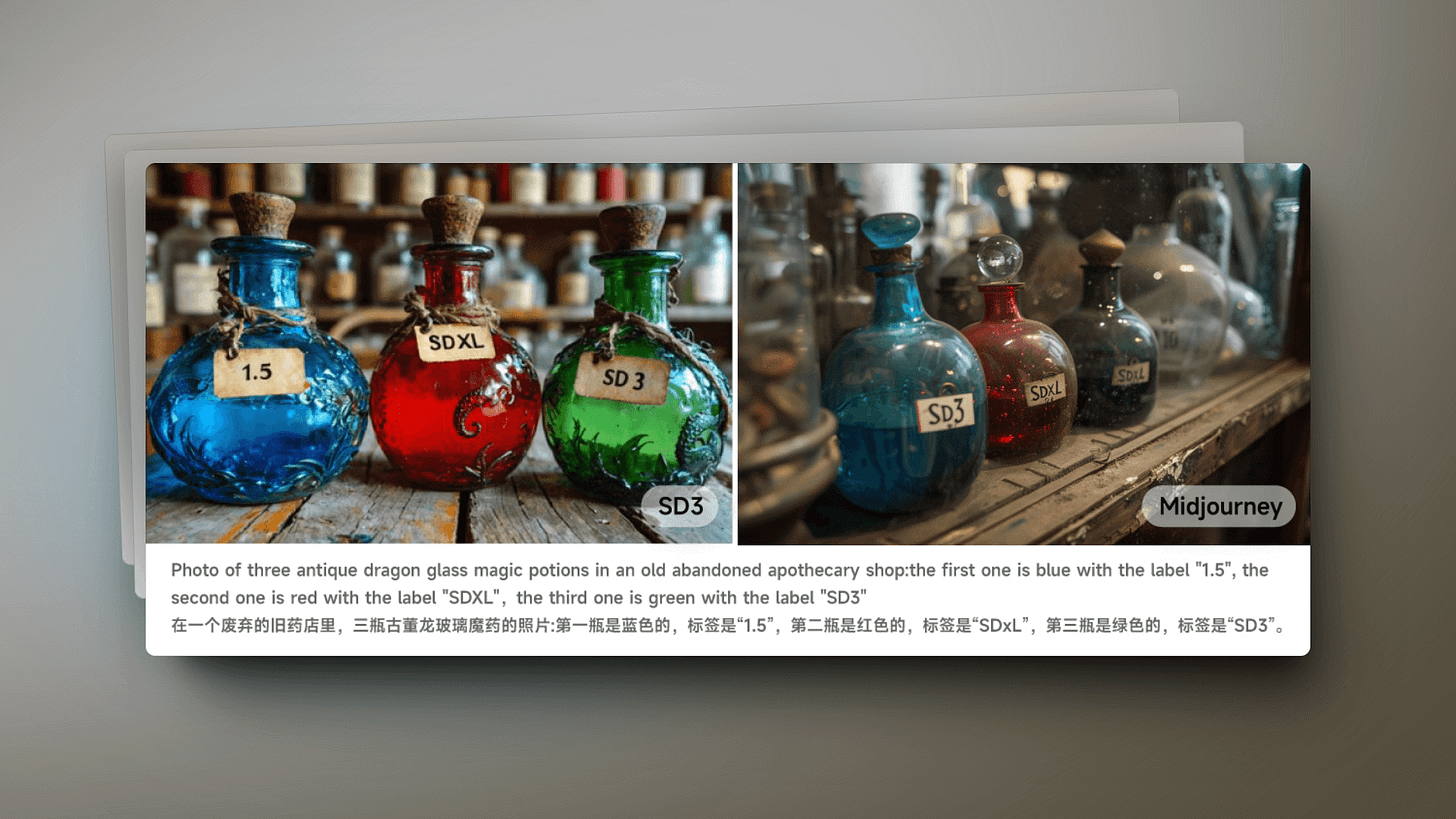 Ability to Understand Complex Natural Language Prompts: SD3 can interpret complex natural language prompts including spatial reasoning, composition elements, pose actions, and style descriptions. Even with intricate instructions like "The first bottle is blue with the label '1.5', the second bottle is red labeled 'SDXL', and the third bottle is green labeled 'SD3'", SD3 can accurately generate corresponding images, with text accuracy surpassing that of Midjourney.