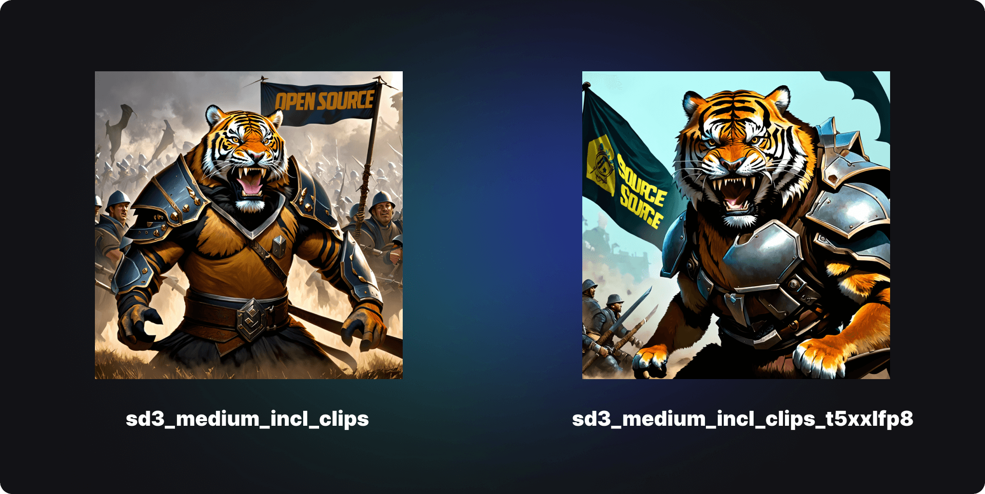 Prompt:Digital art, portrait of an anthropomorphic roaring Tiger warrior with full armor, close up in the middle of a battle, behind him there is a banner with the text "Open Source".