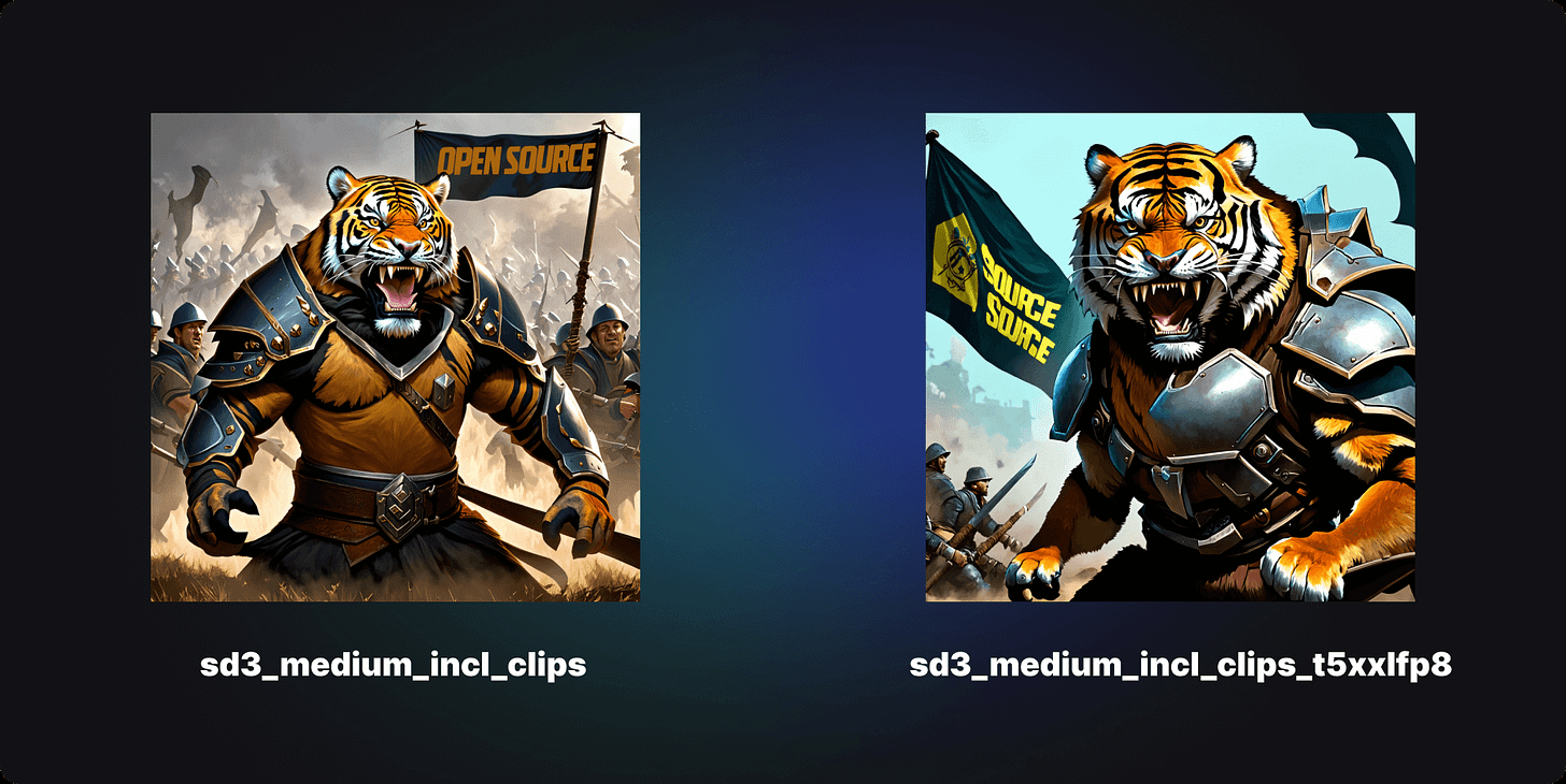 sd3_medium_incl_clips.safetensors: Includes all necessary weights except for the T5XXL text encoder. It requires minimal resources, but the model's performance will differ without the T5XXL text encoder.